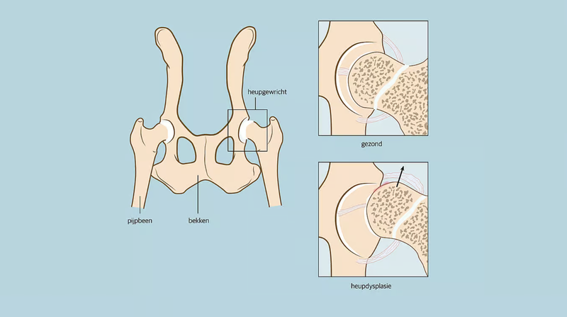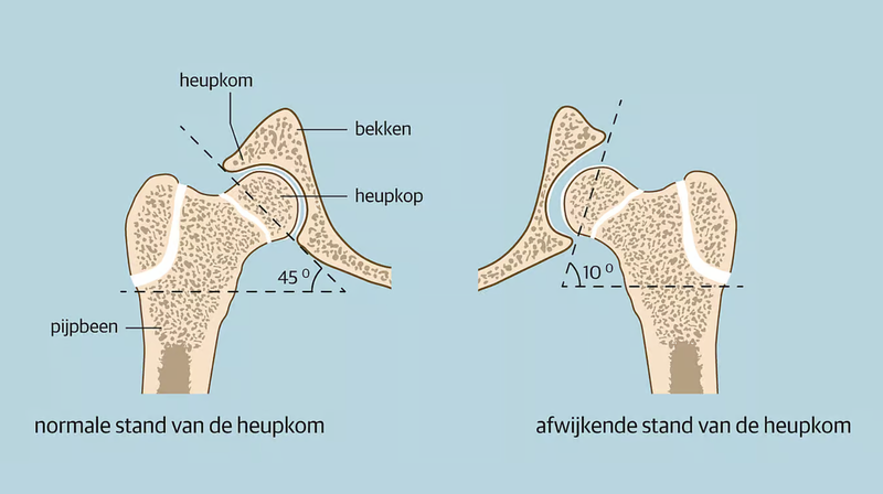 Normale heupen zijn opgebouwd uit een heupkop en een heupkom. De kop zit in de kom en past hier goed in.